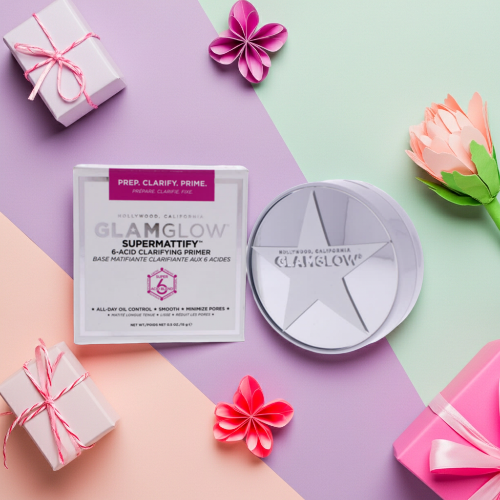 GlamGlow Supermattify Clarifying Face Primer delivers professional-grade mattification in a compact 0.5-oz format. This clarifying primer minimizes pores and controls excess oil, creating an ideal base for seamless makeup application.